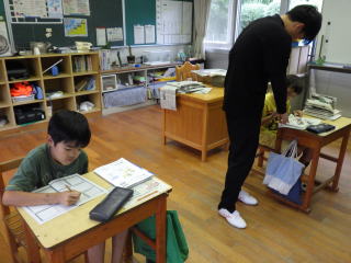 中学年教室を覗いてみると、、、読書カードを記入していました。