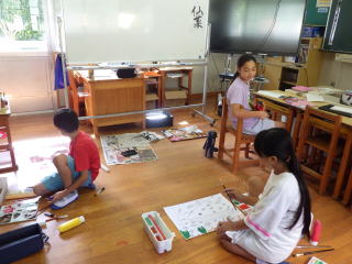 今、分校では読書感想画を描いています。それぞれの作品に工夫が