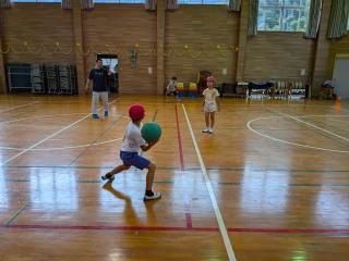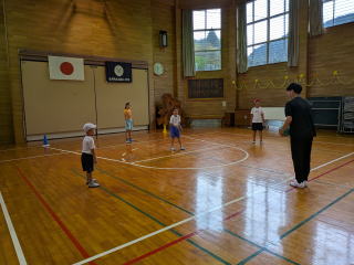 分校の子どもたち。迫ってくるボールの怖さと戦いながら懸命にキャッチをしていました。体育が終わる